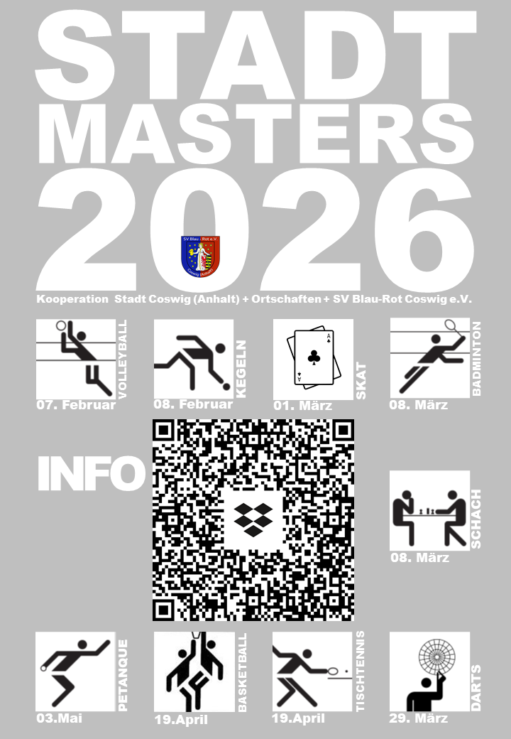 Die Stadt Coswig (Anhalt) veranstaltet zusammen mit dem ansässigen Sportverein verschiedene Stadt-Masters. Unter anderem wird am 08. März ein Schachturnier veranstaltet.