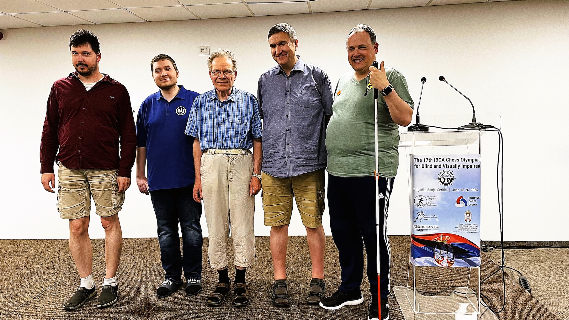 Die deutschen Spieler: Dominik Müller, Mirko Eichstaedt, Olaf Dobierzin, Frank Schellmann und Thorsten Mueller (© Privat Gerhard Dyballa)Der internationale Blindenschachverband IBCA (International Braille Chess Association) führte vom 17. bis zum 25. Juni seine 17. Schacholympiade in Serbien durch. Mit am Start war eine Mannschaft aus Deutschland mit insgesamt fünf Spielern und drei Begleitpersonen. Nach den neun Turniertagen fand sich Deutschland auf Platz sechs wieder, also durchaus im Rahmen der Erwartungen. Herausragender Spieler war am zweiten Brett Dominik Müller, der überlegen eine Einzelgoldmedaille mit nach Hause brachte. Lesen Sie nachfolgend den Abschlussbericht von Frank Schellmann, sowie die täglichen Rundenberichte. (Quelle: DSB)