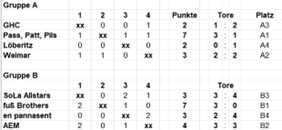 Insgesamt traten acht Mannschaften in zwei Vierergruppen gegeneinander an. In den zwölf Gruppenspielen ging es spannend zur Sache – nur eine Begegnung, die zwischen den "SoLa Allstars" und „en pannasent“, endete mit mehr als einem Tor Unterschied (2:0).