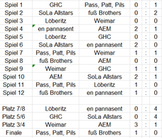 Im Spiel um Platz 7 traf "Löberitz" auf „en pannasent“ und musste sich klar mit 0:4 geschlagen geben. Um Platz 5 kämpften die Gastgeber von "GHC" gegen die "SoLa Allstars". Auch hier fiel die Entscheidung deutlich: 0:4 zugunsten der "SoLa Allstars", die mit späten Treffern den Sieg sicherten. Teamkapitän und Organisator des Wochenendes, Uwe Kurth, zeigte sich trotzdem sehr zufrieden mit der Leistung seines Teams.