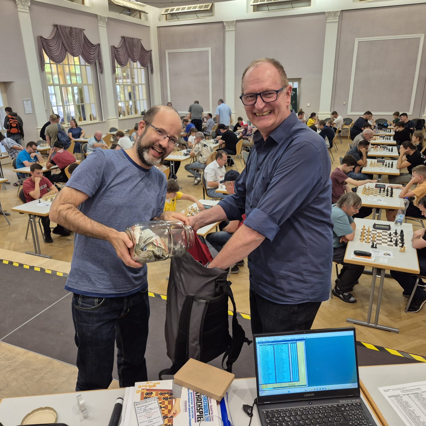 Zuletzt wurde die Kategorie Breitensport ausgewertet. Hier wurden alle Spieler in die Wertung genommen, die über keine DWZ verfügen. Sieger dieser Kategorie wurde der spielstarke Neuzugang der SG Aufbau Elbe, Naweed Ghulami, der beim Hasselbach-Blitz entdeckt wurde. Auf Platz 2 landete der bereits erwähnte Michael Beumer und auf Platz 3 Robin Schuster. Da Robin zur Siegerehrung nicht mehr anwesend war, wurde der 4. Armin Voß ausgezeichnet. Der Landesbehindertenbeauftragte Christian Walbrach hatte tolle Andenkenpreise mitgebracht: 6 Bücher des Karikaturisten Phil Hubbes, mit einem schicken Ton-Gefäß, welches von der Lebenshilfe Magdeburg angefertigt und verkauft wird.